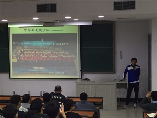 在与大家分享中国女足U16国少队备战情况的同时,任定猛副教授也对足球专项的广大学生提出了随队实习的工作建议,包括要增强在计算机应用、组织计划、现代摄像技术、视频分析技术、专业理论写作能力、外语能力以及实践等各方面的能力,这就为有志于随队实习、增加实践经验的学生指明了努力的方向,同学们听得都非常认真。在提问与讨论环节,同学们也就体能训练、比赛中的教练员指导以及外语学习等话题与任定猛副教授进行了精彩地交流与探讨,气氛热烈。