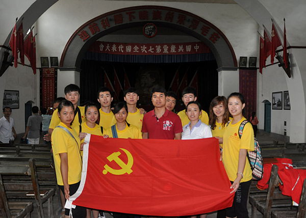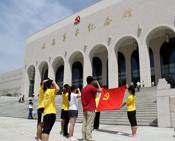为强化党团学习,实践团在出发前,成立了临时党支部。24日下午,实践团一行分别参观了延安革命纪念馆和枣园、杨 家岭等革命旧址。抚今追昔,毛泽东、周恩来、任弼时、彭德怀、刘少奇等老一辈无产阶级革命家艰苦奋斗、顽强拼搏和大无畏的精神使大家心灵受到了震撼和洗礼。在延安革命纪念馆门口,在临时党支部书记高强的领誓下,全体党员面对党旗进行了庄严地入党宣誓,并立誓做到“忠心为党,全心为民”。