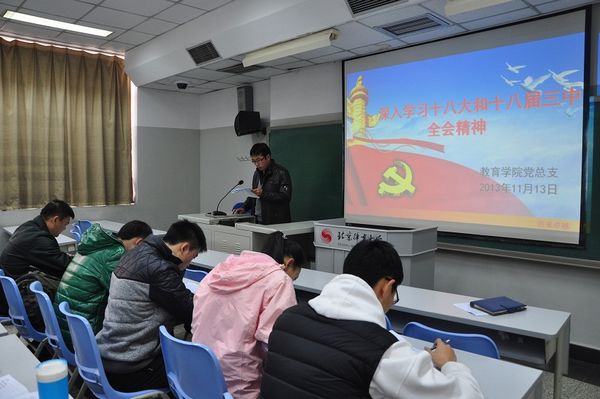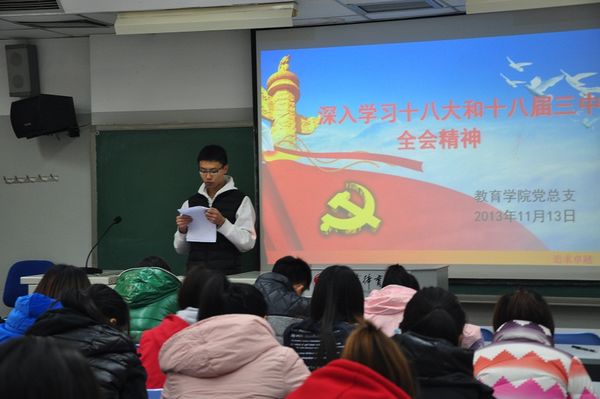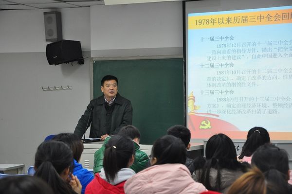 参观校史馆活动结束后,聂伟书记在教学楼103教室为大家进行了题为“深入学习十八大和十八届三中全会精神”的专题讲座。他从十八大和十八届三中全会会议公报入手,回顾并解读了1978年以来历届三中全会的主要精神,并结合当前国家的改革形势和学校的发展对大家提出,要理论联系实际进行思考,深入学习,加强自身提高。于作军老师和几位同学现场领读了十八届三中全会公报。