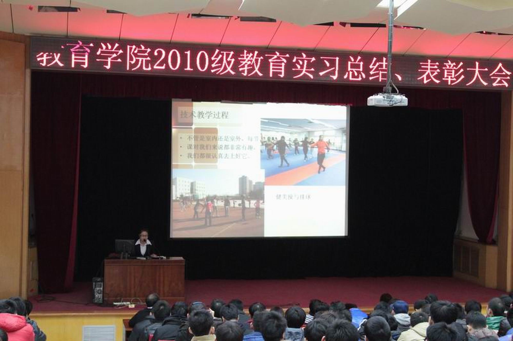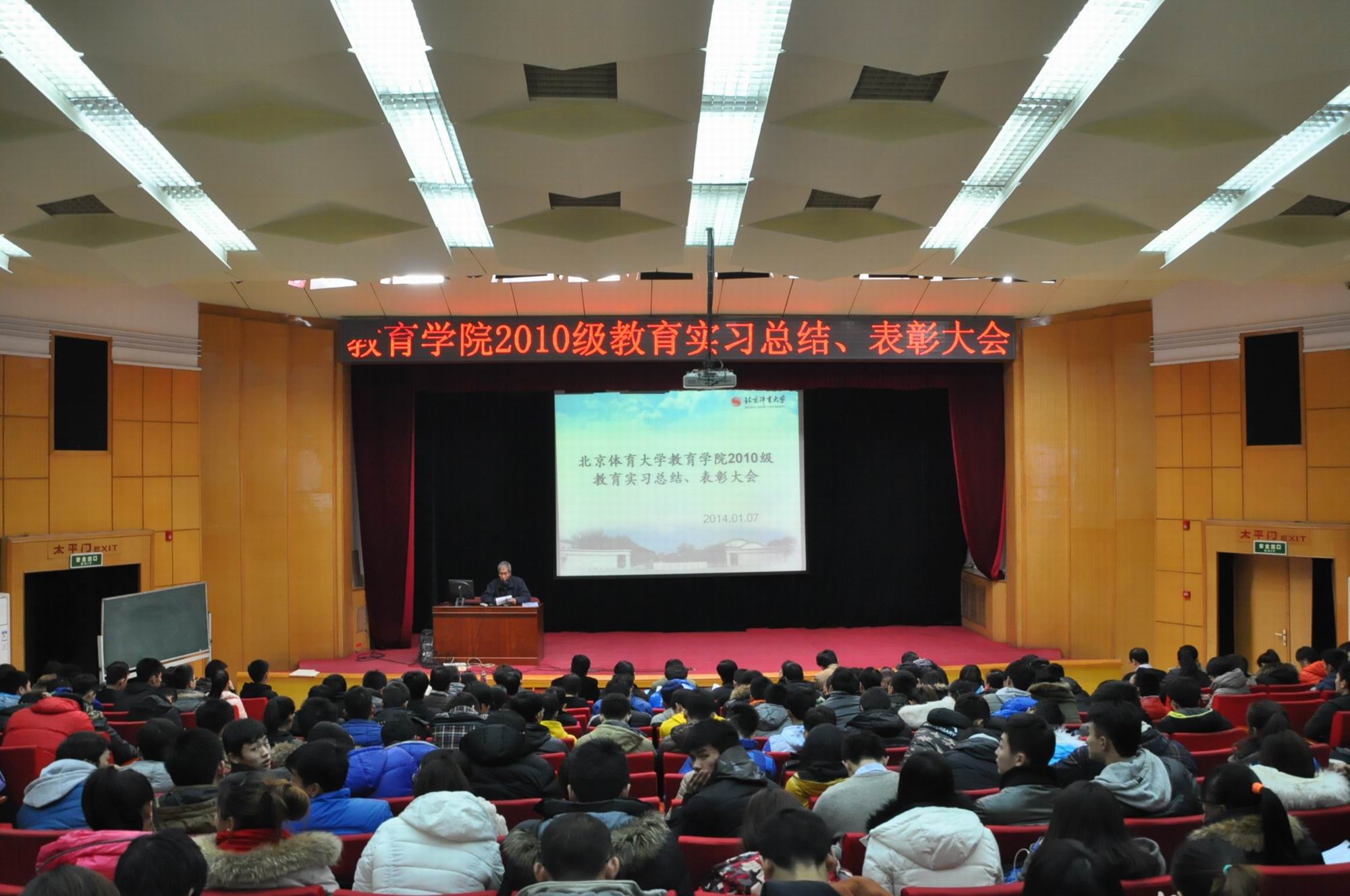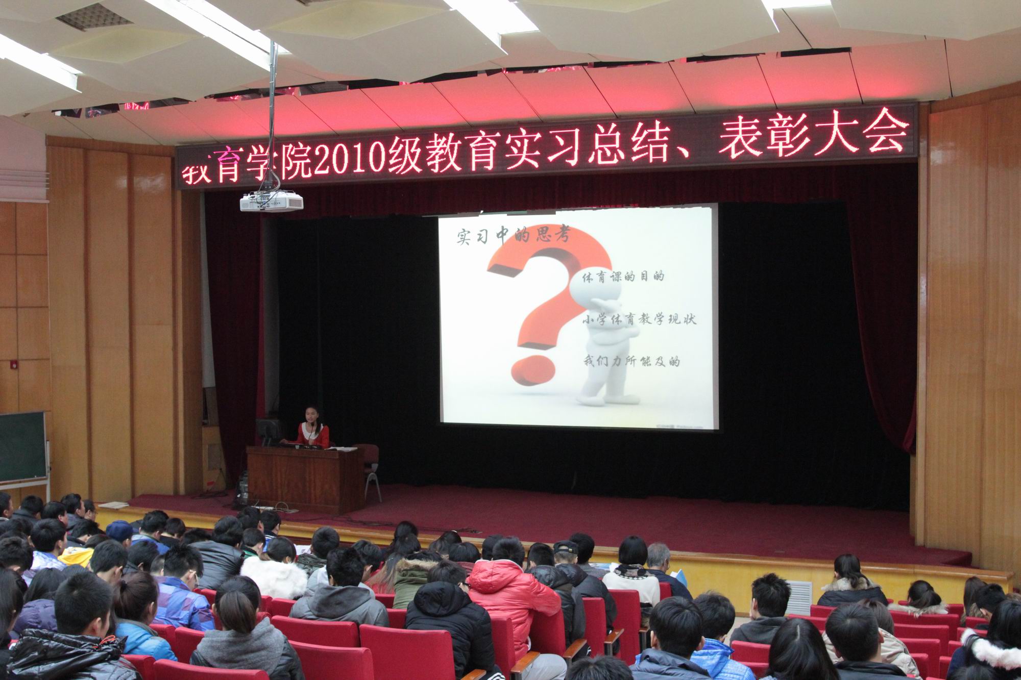 2014年1月7日上午9点,威尼斯9499登录入口2010级在大学生活动中心召开了教育实习总结暨表彰大会。大会由武文强副院长主持,参加会议的有刘大庆副校长,教务处章朝晖副处长,威尼斯9499登录入口的王华倬院长、聂伟书记和尚迎秋副书记,学校各带队指导老师、实习基地23位指导老师以及2010级与2011级的同学。