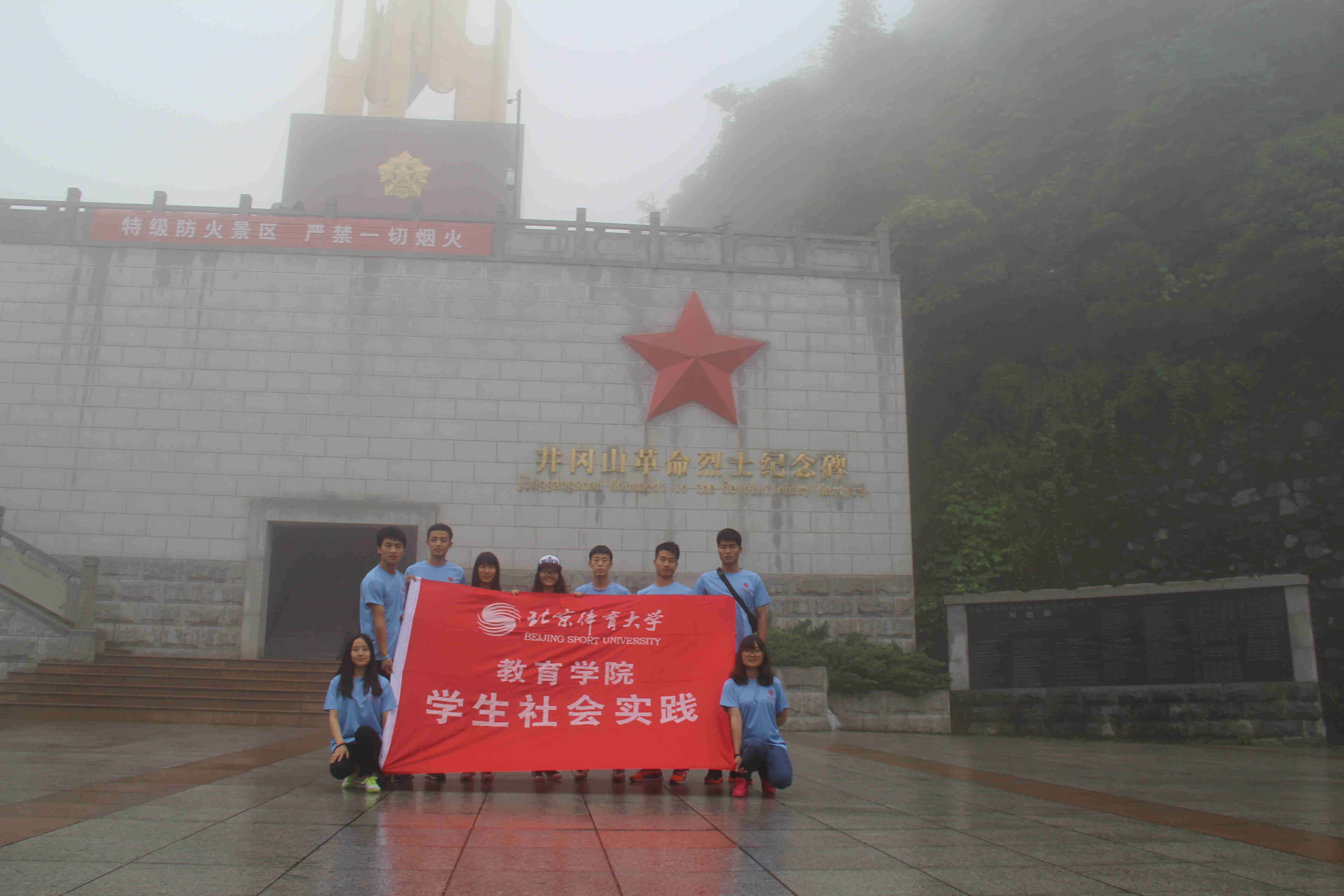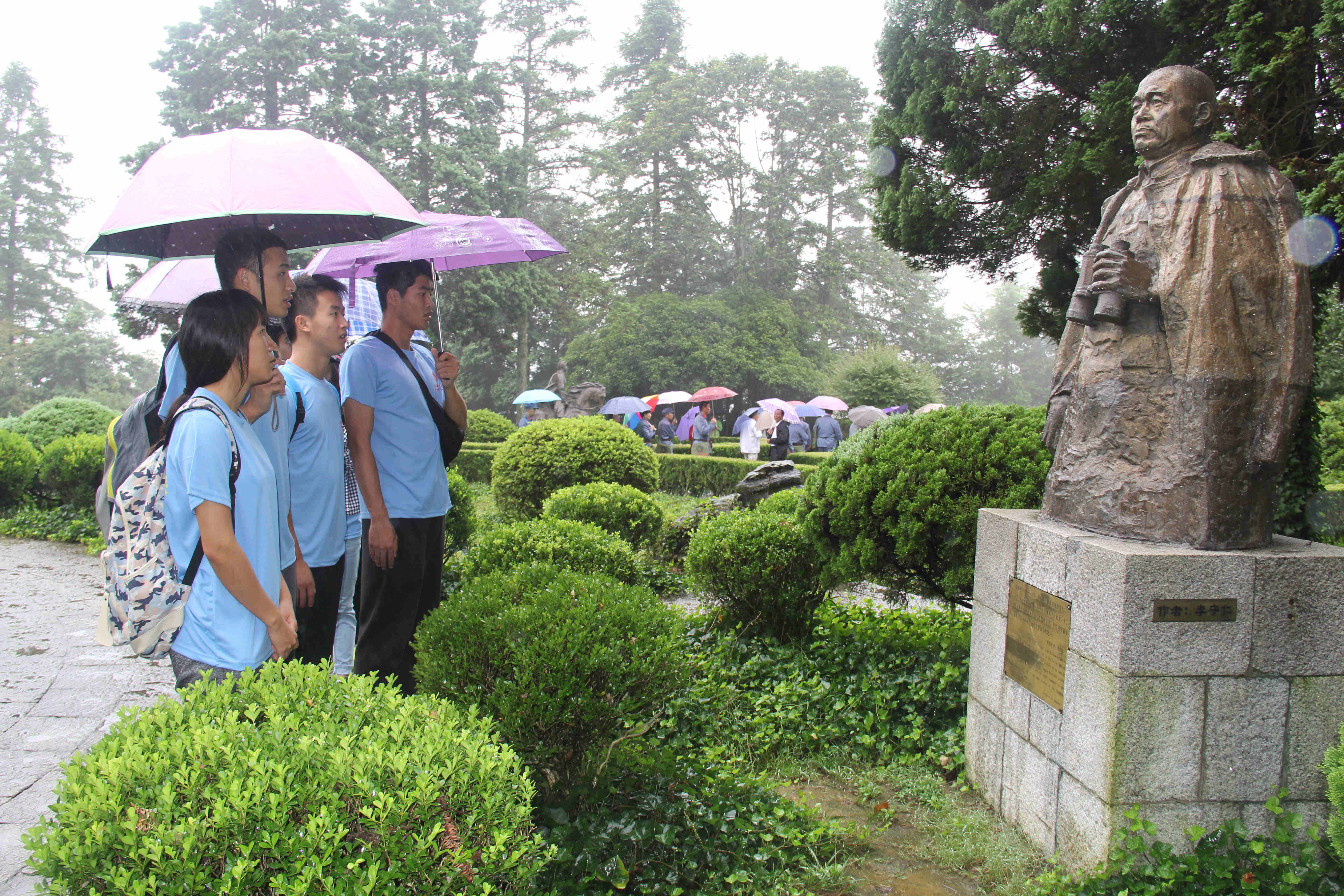 上午9时,实践团成员冒着雨参观了井冈山革命烈士陵园。进入纪念堂,同学们首先在瞻仰大厅对着死难烈士进行鞠躬默哀。经过雕像园,走在一个个巨形浮雕前,同学就像是游走在一个个鲜活的生命之间,看着一个个浮雕下铭刻的英勇事迹,同学们心中不由升起敬佩之情。在陵园顶处,一座耀眼光芒的纪念碑高高耸立,令人敬仰。实践团成员带着对历史的敬畏来缅怀先烈,心中充满了自豪和感慨。