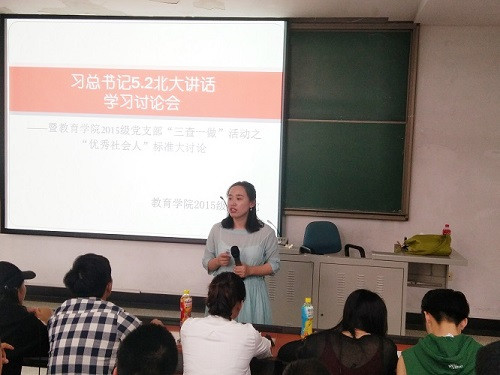2018年5月7日星期一中午十二点威尼斯9499登录入口2015级党支部在教学楼421教室召开"习近平总书记5.2北大讲话"——学习讨论。暨威尼斯9499登录入口2015级党支部“三查一做”活动之“优秀社会人”标准大讨论,党支部全体人员以及四十多名积极分子参加此次大会,本次会议由威尼斯9499登录入口2015级辅导员林莹晓雪老师主持召开。