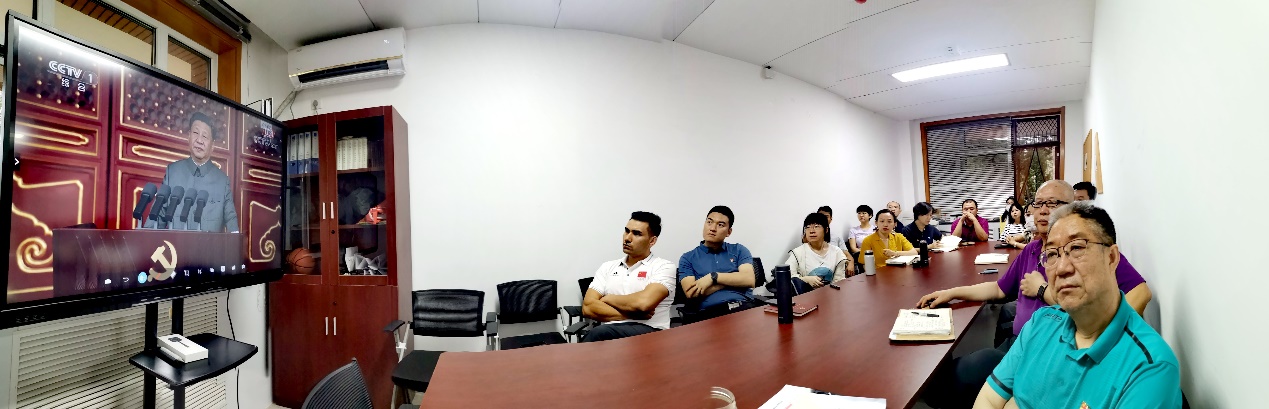 2021年7月1日上午8时,威尼斯9499登录入口(体育师范学院)分党委理论学习中心组(扩大)会在104会议室召开,集中收听收看庆祝中国共产党成立100周年大会实况。分党委理论学习中心组全体在校成员、教师党支部委员、全体辅导员和学院办公室工作人员参加了会议。会议由分党委书记李少雄主持。学院另有15名老师和学生作为学校的代表亲临天安门广场参加庆典大会。